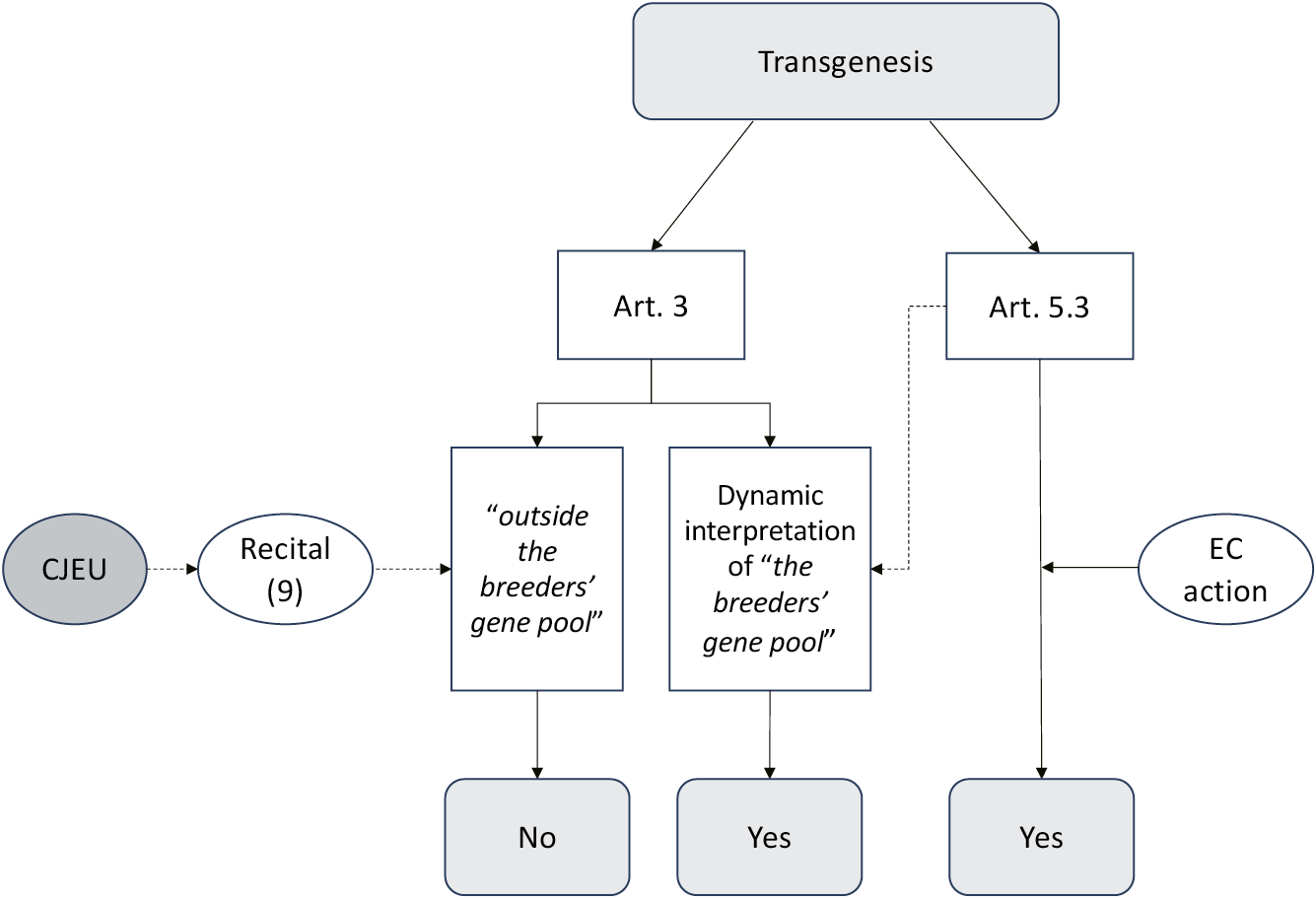 Fig. 1. Potential coverage of transgenesis by the European Commission’s Proposal on NGTs (COM(2023) 411 final) depending on the interpretative pathways adopted and on whether further action is taken by the European Commission. It must be reminded that the interpretative path of Art. 3 favourable to the inclusion of transgenesis is not the most reasonable one, and, in fact, it is limited by the recital (9) of the proposal itself; but it shows the potential cracks existing in the proposed legislation, the exploitation of which, by sectors opposed to the new biotechnology, might end up compromising its success, and, consequently, innovation in this field