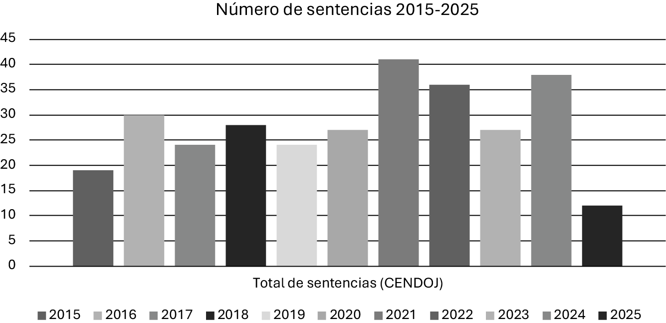 [7] El estudio realizado se basa en el CENDOJ a través de la revisión de todas las sentencias de los últimos 10 años, para el cual se ha filtrado por categoría de delitos contra el medio ambiente, hasta la fecha 22 de julio de 2025. Se han obtenido los datos del estudio mediante: categoría “DELITOS CONTRA EL MEDIO AMBIENTE” y tipo de resolución: sentencias sin tener en cuenta autos. Una de las limitaciones de esta búsqueda es introducir la categoría medio ambiente porque los resultados aluden en muchas ocasiones a otros tipos penales no relacionados o a delitos de maltrato animal.